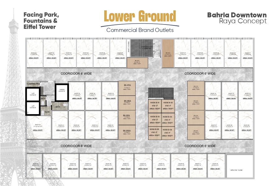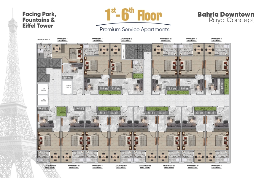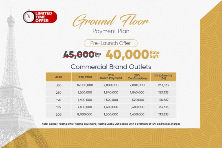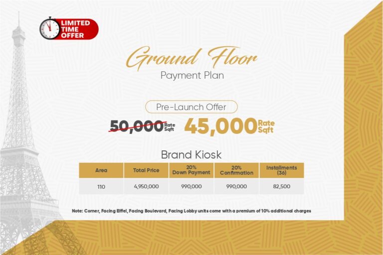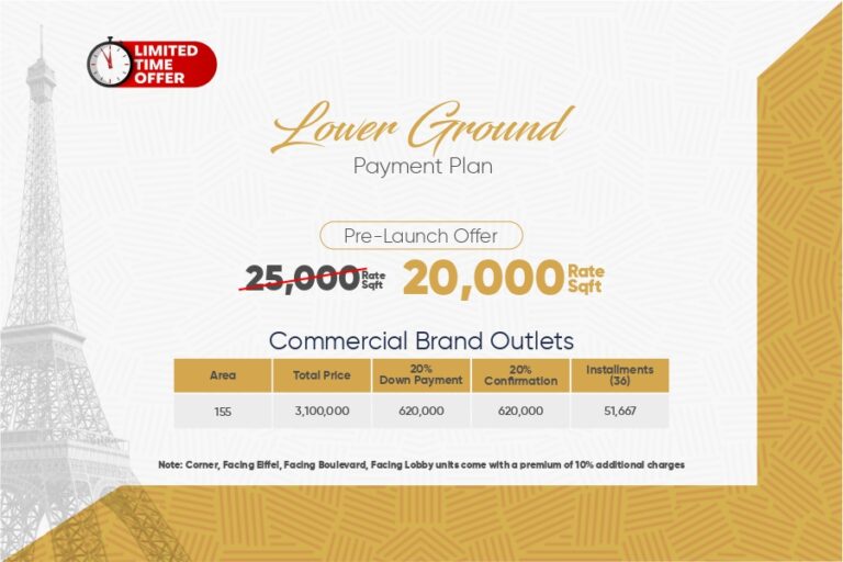 The lower ground and ground floors are allocated for commercial brand outlets and kiosks, ensuring excellent visibility with high foot traffic. From the first to the sixth floor, you’ll find premium service apartments tailored for contemporary living. Each floor is meticulously designed to enhance functionality, comfort, and offers stunning views of Bahria Downtown and the Eiffel Tower.